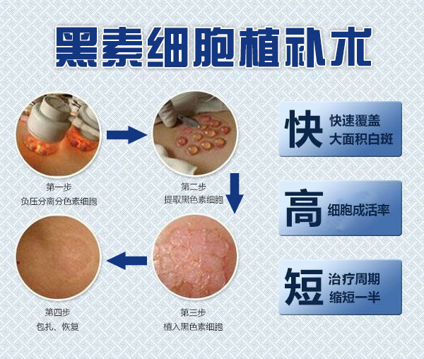 黑素细胞植补法通过黑色素细胞种植系统,从患者自体细胞中分离出活性黑色细胞,将足量的黑素母细胞种植在白癜风皮损处,并注入免疫因子,使其在稳定的状态下存活,恢复黑素母细胞的正常机能,快速促使白斑区域恢复正常肤色。黑色素细胞植补术要种植多久见效?